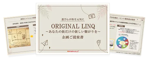 毎回ゼロから地域活性施策を企画し、単発で終わっていませんか?ORIGINAL LINQは、【継続開催】により参加者を増やし、地域への愛着醸成や理解促進につながる宝探し/謎解きイベントです。さらに、【参加者データ】を活用し、継続的な情報発信により、地域PRやリピーター創出にもつながります。